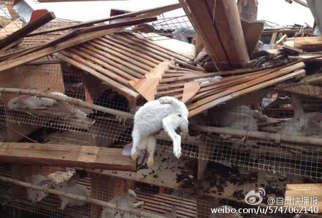 7月12日凌晨5時許,陣性大風(fēng)突襲四川自貢榮縣古文鎮(zhèn),風(fēng)災(zāi)使古文鎮(zhèn)山邊村鄉(xiāng)巴佬養(yǎng)殖基地6000平米兔舍垮塌,事發(fā)時,該兔舍共有26000只兔子。記者在現(xiàn)場看到,兔舍頂棚已經(jīng)被完全吹跨,木制橫梁和隔板隨處散落,部分兔舍仍有大量兔子被埋,10余名工人正在清理現(xiàn)場和搶救活兔。據(jù)兔舍負(fù)責(zé)人介紹,經(jīng)過近30多小時生產(chǎn)自救已搶救出5000余只活兔,初步估計有10000余只兔子死亡,直接損失超過300萬元。(記者 曹實秋)圖片來源:華西都市報自貢城市頻道官方微博