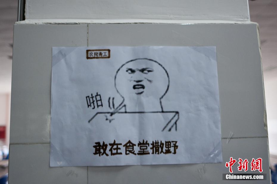近日,四川農(nóng)業(yè)大學(xué)食堂的“魔性”表情包告示牌在網(wǎng)絡(luò)走紅。告示牌上除了夸張的“魔性”圖案,還配有“吃完盤中餐,不做剩男剩女”、“敢在食堂撒野”、“默默吃著飯”等文字。四川農(nóng)業(yè)大學(xué)工作人員介紹,這組魔性表情包告示牌由該校農(nóng)學(xué)院同學(xué)們自發(fā)創(chuàng)作張貼,目的是為了讓同學(xué)們不要浪費(fèi)糧食,注意排隊(duì)。 四川農(nóng)業(yè)大學(xué)供