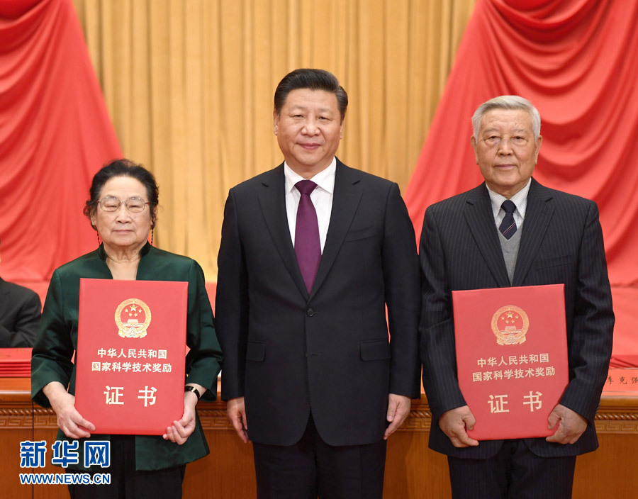 1月9日,2016年度國家科學技術(shù)獎勵大會在北京人民大會堂隆重舉行。中共中央總書記、國家主席、中央軍委主席習近平向獲得2016年度國家最高科學技術(shù)獎的中國科學院物理研究所趙忠賢院士(右)和中國中醫(yī)科學院屠呦呦研究員(左)頒獎。新華社記者 李學仁 攝