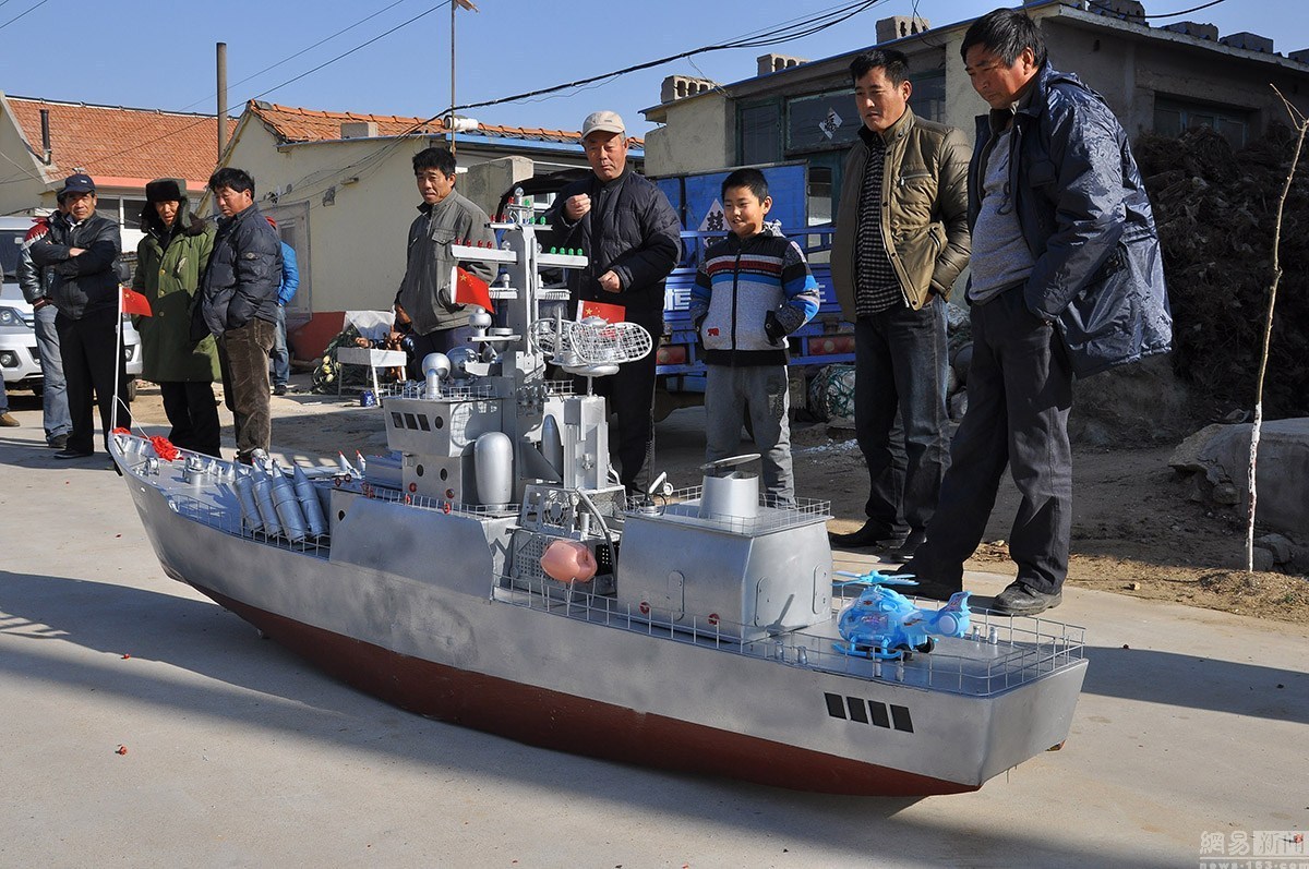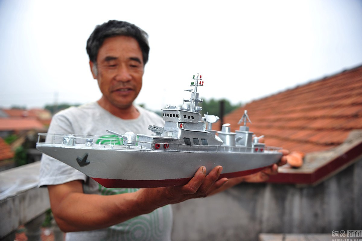 郭長海,初小文化,當(dāng)過27年的船長。2005年,迫于海洋漁業(yè)的枯竭,他將漁船賣掉。但是仍然割舍不了對大海的依戀之情。平時,他喜歡從電視上了解國家大事,最愛看軍事頻道,耳濡目染,于是對軍艦產(chǎn)生了濃厚的興趣。農(nóng)閑的時候,郭長海便琢磨起了艦艇模型的制作。
