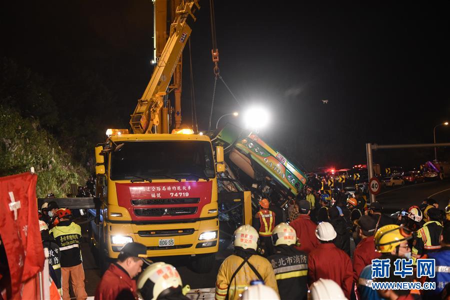 2月14日,事故車(chē)輛被吊車(chē)吊起。據(jù)臺(tái)灣消防部門(mén)2月14日零時(shí)許發(fā)布的消息,13日晚發(fā)生的翻車(chē)事故已造成32人死亡,受傷的12人已全數(shù)送醫(yī)。新華社記者從臺(tái)灣公路警察部門(mén)獲悉,游覽車(chē)上沒(méi)有大陸游客。臺(tái)北市消防局通報(bào),13日21時(shí)6分許,在臺(tái)灣公路主干道5號(hào)南港系統(tǒng)交流道接3號(hào)南下路段,臺(tái)北市蝶戀花公司一輛游覽車(chē)翻覆于引道邊坡,車(chē)內(nèi)共44人(游客42人,導(dǎo)游、司機(jī)各1人),其中死亡32人(30人未送醫(yī),2人送醫(yī)后不治),12人送醫(yī)持續(xù)治療中。新華社記者 歐東衢 攝