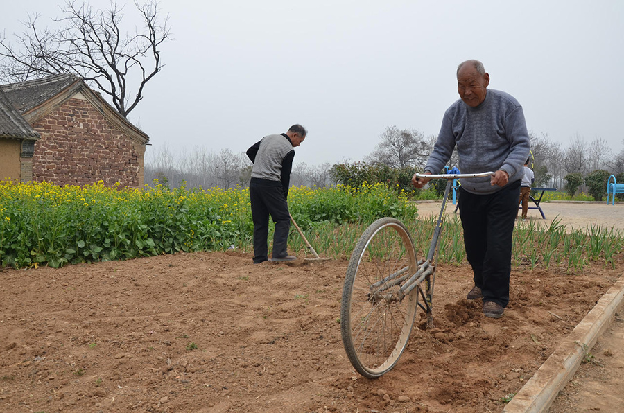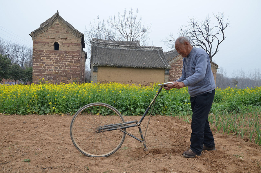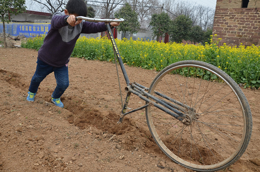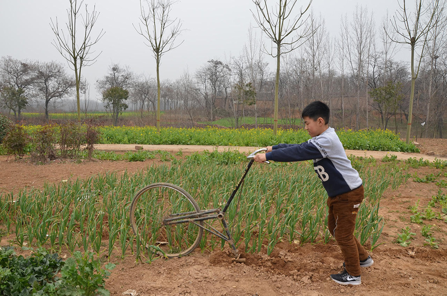 這種種菜的小地塊,推拖拉機(jī)過來翻有點(diǎn)兒擱不住,拿鋤頭鋤又有些費(fèi)力,還好有這個(gè)神奇單車,連小孩子都能干活了。