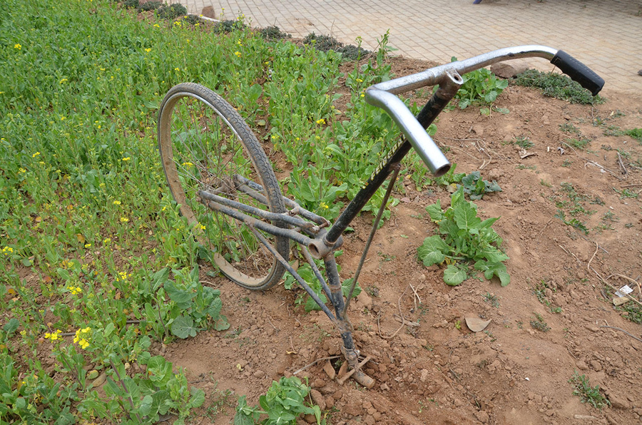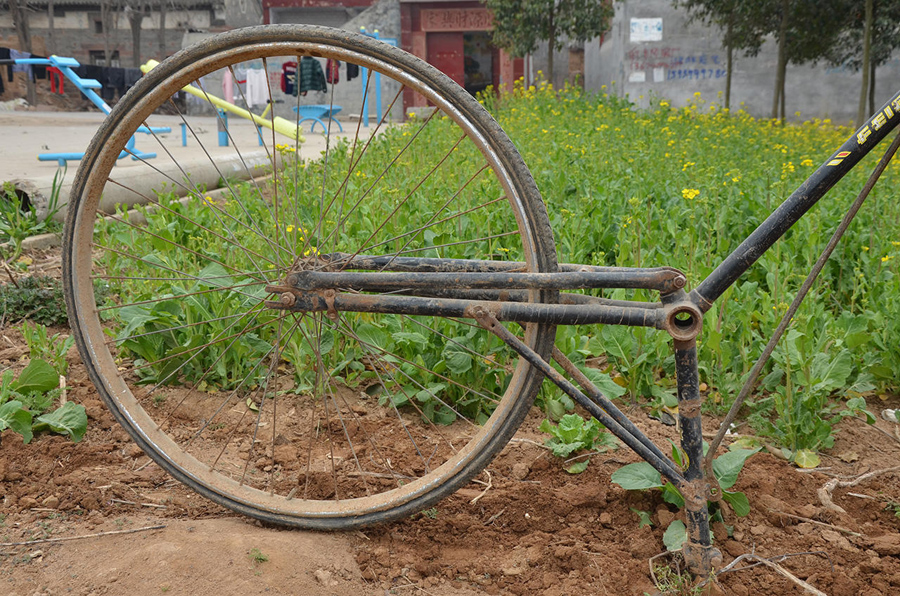 它現(xiàn)在的作用是鋤的角色,多少還有點(diǎn)兒犁的意思,但前身是一輛二八型的大自行車,仔細(xì)觀察了一下,這個(gè)輪子應(yīng)該是車子的后輪。