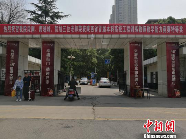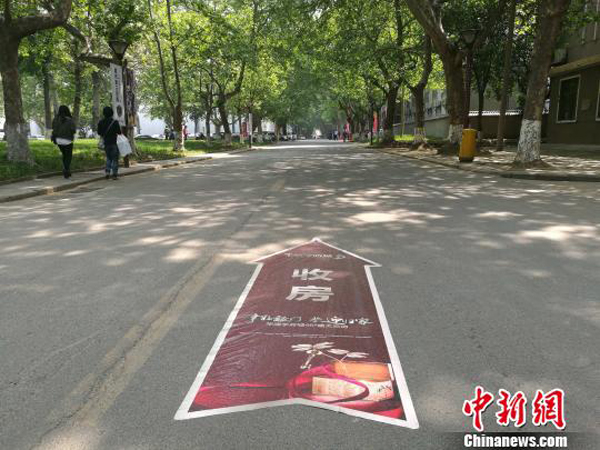 校園內(nèi)貼有收房指示路標(biāo)。記者4月27日在西安建筑科技大學(xué)華清學(xué)院看到,華清學(xué)府城與該校緊鄰,中間有一道門(mén)可以進(jìn)出。樓盤(pán)交房廣告標(biāo)語(yǔ)張貼于學(xué)校大門(mén)的門(mén)柱上,寫(xiě)有“交房臨時(shí)停車(chē)由此進(jìn)入”、“46#樓交房現(xiàn)場(chǎng)由此前行”、“熱烈祝賀46#樓盛大交房”等標(biāo)示。