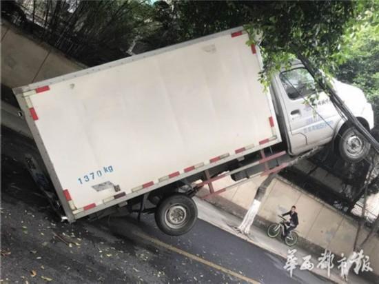 5月10日早上,成都高升橋北街,一輛貨車玩起“特技”,車頭掛在線纜上,四輪騰空,造成道路擁堵,索性無人員傷亡。隨后,記者從成都交警一分局獲悉,該事故的罪魁禍?zhǔn)?,是掉落的通訊線纜。來源:華西都市報
