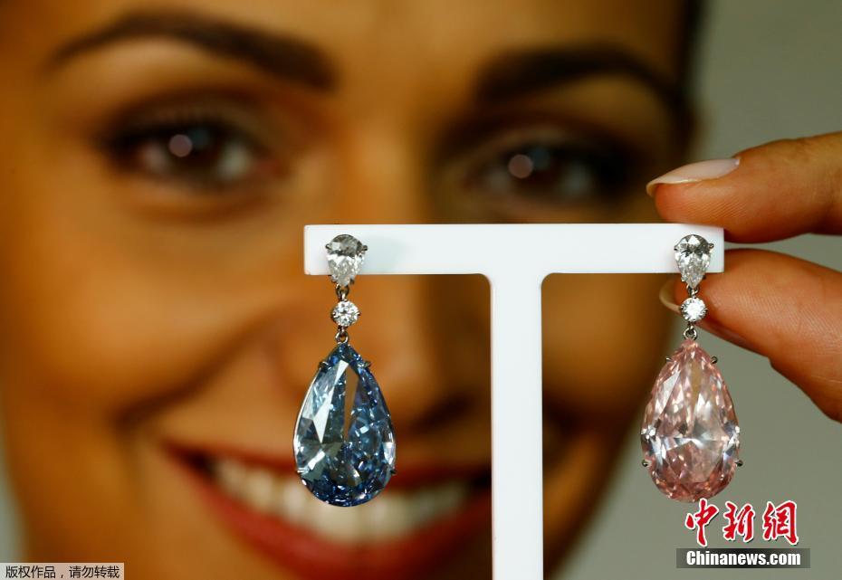 當(dāng)?shù)貢r間2017年5月11日,瑞士日內(nèi)瓦,14.54克拉的“阿波羅藍(lán)”和16克拉的“阿耳特彌斯粉”鉆石耳環(huán)即將在蘇富比拍賣行拍賣,估價分別為3800-5000萬美元和1250-1800萬美元。
