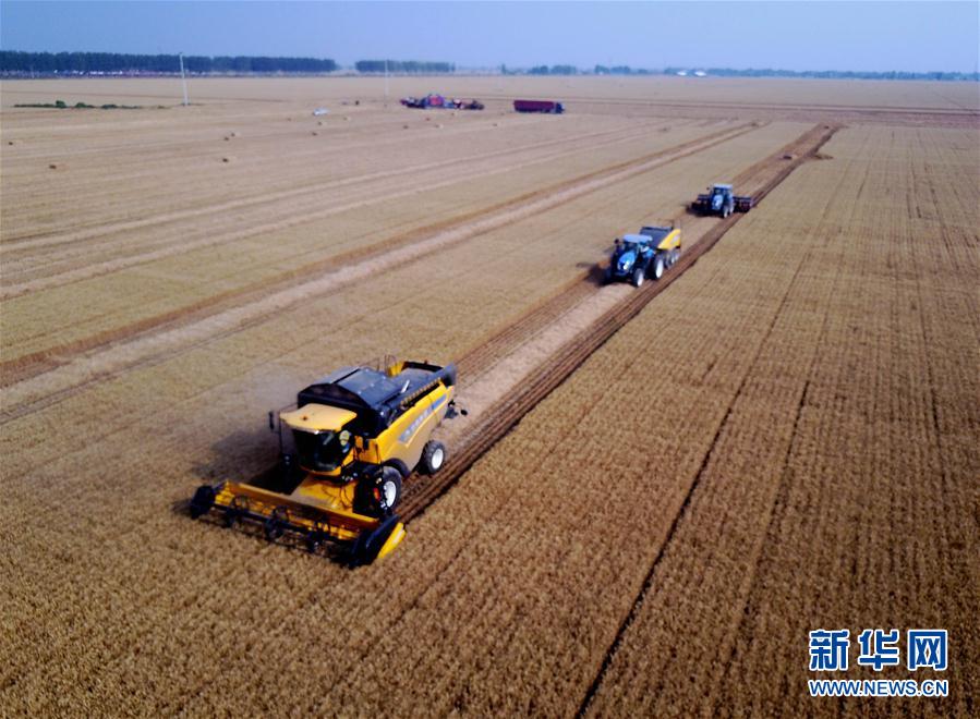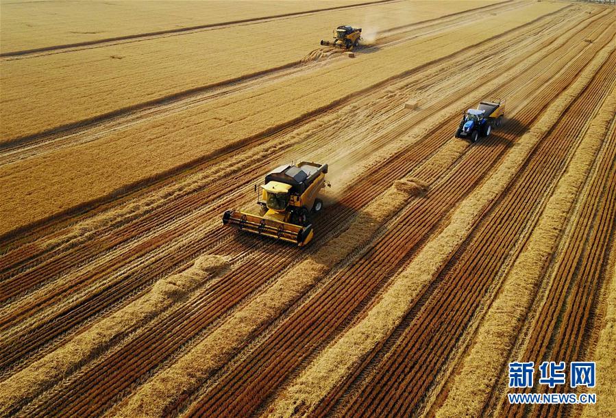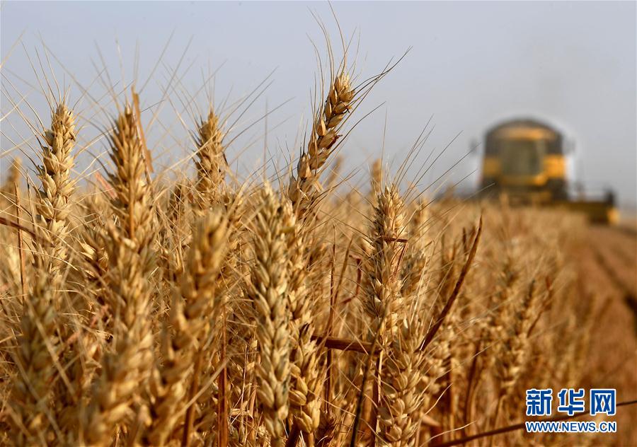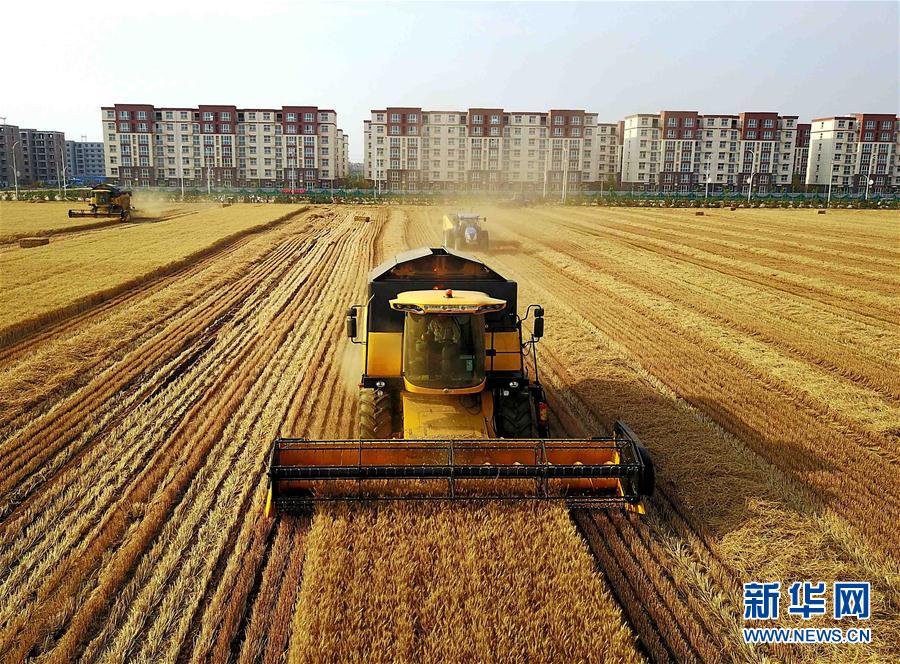 6月7日,在河南??h中鶴現(xiàn)代農(nóng)業(yè)示范園區(qū)的麥田里,收割機在收獲小麥。新華社記者 李安 攝