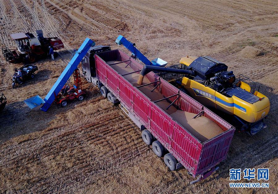 6月7日,在河南??h中鶴現(xiàn)代農(nóng)業(yè)示范園區(qū)的麥田里,一臺收割機將收獲的小麥裝車。新華社記者 李安 攝