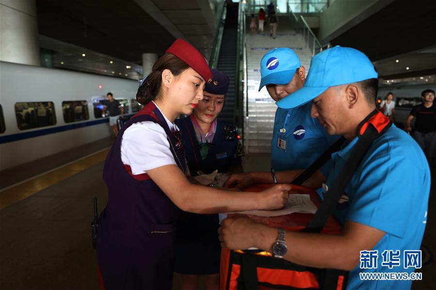 7月17日,在西安北站,配送員將餐食交給列車工作人員。當(dāng)日,鐵路部門在省會(huì)及計(jì)劃單列市所在地的27個(gè)主要高鐵客運(yùn)站,推出動(dòng)車組列車互聯(lián)網(wǎng)訂餐服務(wù),為旅客提供更多品種、口味的餐食服務(wù)。旅客可通過12306網(wǎng)站、手機(jī)APP等方式完成預(yù)訂。新華社發(fā)(張鑫 攝)