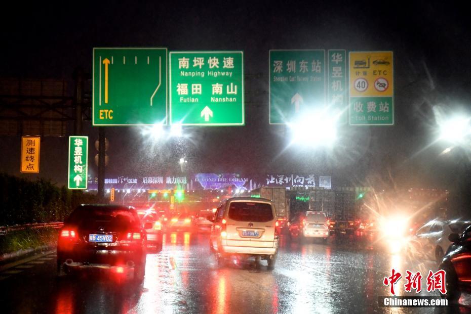 7月18日,深圳普降大暴雨局部特大暴雨,致部分路段嚴(yán)重積水、山體滑坡道路中斷、交通擁堵等險(xiǎn)情。深圳鹽田區(qū)盤山公路恩上路段出現(xiàn)滑坡,無人員、車輛被困;深鹽二通道下沙頭角出口匝道中間因山水傾瀉,道路中斷,交警已經(jīng)實(shí)施了交通管制。當(dāng)?shù)貧庀蟛块T先后發(fā)布了雷電、暴雨黃色、暴雨橙色和暴雨紅色分區(qū)預(yù)警信號(hào)。圖為深圳南坪快速路段車輛行駛緩慢。中新社記者 陳文 攝