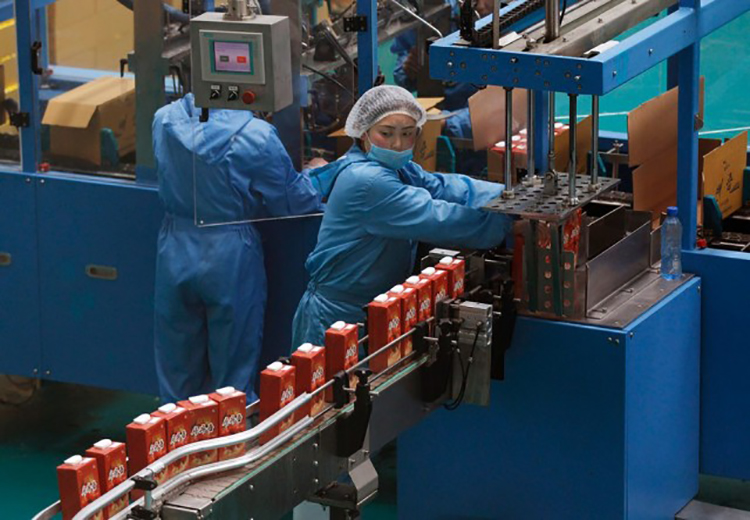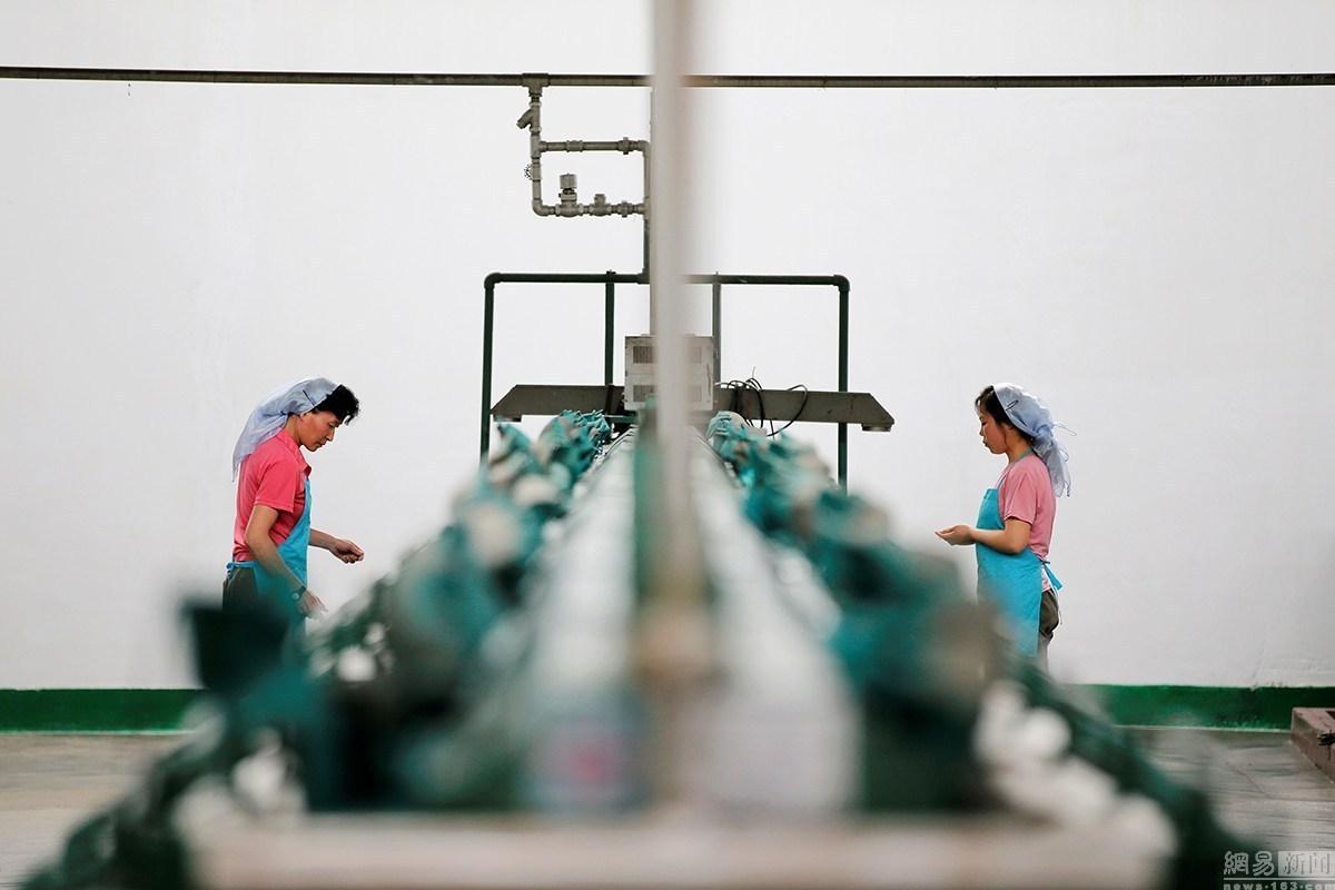 工人在一家工廠的果汁生產(chǎn)線進(jìn)行操作,這附近的Daedonggang水果農(nóng)場(chǎng)坐落在平壤郊區(qū),擁有125公頃的蘋(píng)果樹(shù)。