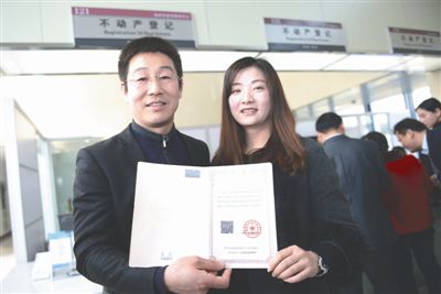 3月1日,在江蘇徐州市不動產(chǎn)登記交易服務(wù)中心,市民邢衛(wèi)鋒、趙媛媛夫婦在展示編號為001的不動產(chǎn)權(quán)證書。當(dāng)日,《不動產(chǎn)登記暫行條例》開始施行。國土資源部部長姜大明在江蘇徐州市為申請領(lǐng)證的市民頒發(fā)了全國第一本不動產(chǎn)權(quán)證書。新華社發(fā)