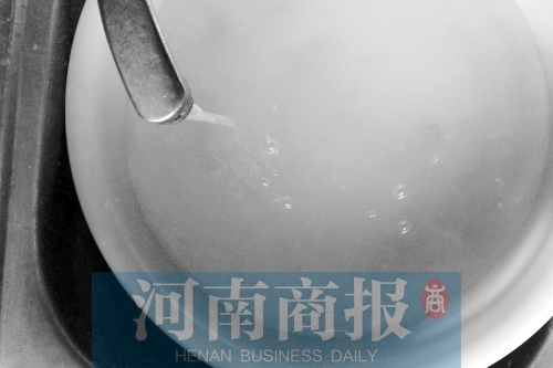 進(jìn)入一居民家后,居民迫不及待地打開水龍頭。河南商報(bào)記者看到,剛從水龍頭里接出來的水確實(shí)像面湯一樣白稠,放置半分鐘后,水開始變清,再過一段時(shí)間,接水盆盆底開始顯現(xiàn)出一層紅色的沙子。