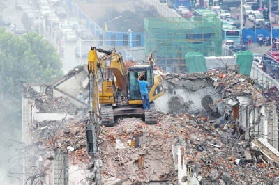 昨日下午,鄭州市區(qū)農(nóng)業(yè)路文化路東北側(cè),農(nóng)業(yè)路北半幅車行道上方已架起臨時(shí)擋塵棚,一座早已搬遷一空的多層建筑已被圍擋圈起,一輛拆遷機(jī)械不知何時(shí)已“爬”上十多米高的屋頂,在對建筑的主體結(jié)構(gòu)進(jìn)行逐一粉碎。建筑垃圾紛紛墜落,地上到處是砸下來的磚礫,旋即在建筑物四周蕩起白色的、灰色的揚(yáng)塵。揚(yáng)塵凝成濃霧,沖破圍擋飄向四周,向農(nóng)業(yè)路甚至更遠(yuǎn)的地方擴(kuò)散。雖然現(xiàn)場無風(fēng),但這裹挾著大量塵土的白霧扶搖直上,超過頂層的高度,將這座正在拆遷中的建筑物籠罩在一片白色煙霧中。
