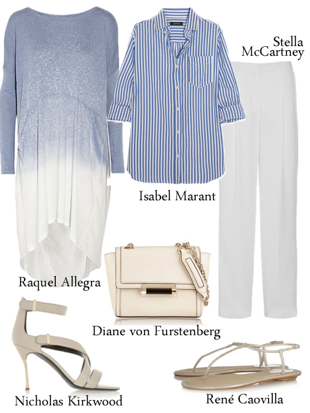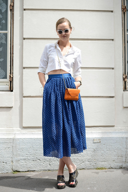 雪白干凈的襯衣加上藍(lán)色鏤空雕花百褶棉布長裙,夏天這么清清爽爽就很好,兩個(gè)顏色都干凈純粹,沒有一點(diǎn)夸張激烈的視覺沖突,所日才如此備受好評(píng),你看夏日最受寵的白T恤配牛仔也是藍(lán)天白云的基調(diào)。