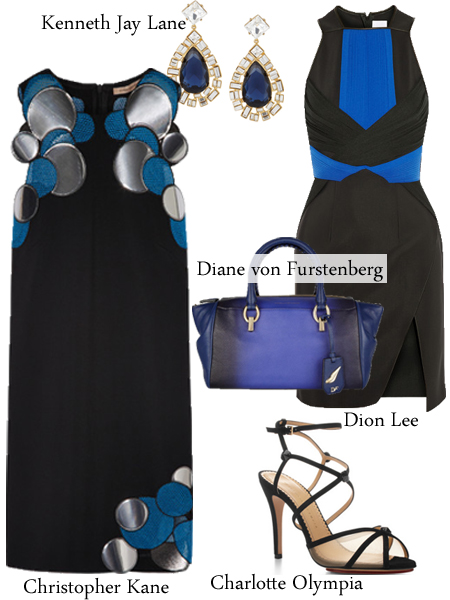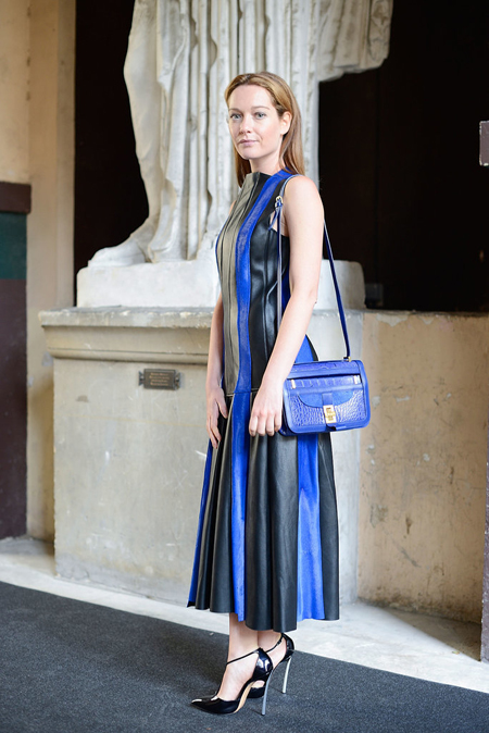 如果藍(lán)色和白色是清新的組合,那么藍(lán)色和黑色則是嚴(yán)謹(jǐn)律政佳人的標(biāo)配,皮革在藍(lán)黑條紋和褶裥的錯(cuò)落下仿佛鋼琴鍵般抑揚(yáng)頓挫,單肩包和黑色漆皮高跟鞋則一唱一和將整體搭配湊得完整和諧。