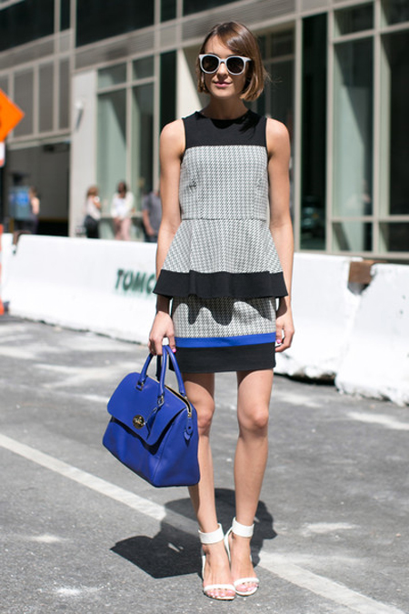 這套藍(lán)色連衣裙也是腰間插荷葉邊款式,因面料的挺括質(zhì)感和上半身的開胸設(shè)計(jì)取勝,性感不失大氣,荷葉邊的參差也帶來設(shè)計(jì)上的突破和新穎,另外藍(lán)色手拿包和嫩黃色高跟鞋也搭配的恰到好處,呼應(yīng)又不乏悶。