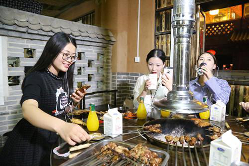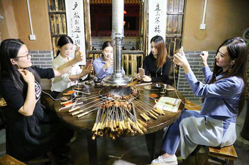 在岳家水滸烤肉店里,主播們剛剛坐下直播,就吸引來(lái)了在店里消費(fèi)的其他顧客,肉都顧不上吃了,求合影,求關(guān)注……