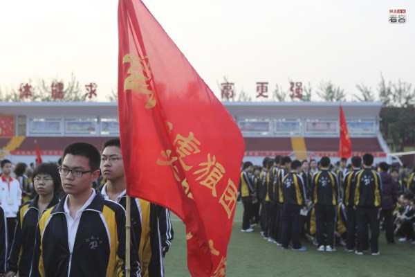 這樣的誓師大會每年都會舉行,而類似于誓師的各種勵志行動在這里都相當常見。圖為2012年5月1日,衡水二中操場上,一名學生舉著寫有“虎狼團”字樣的旗幟參加跑操。