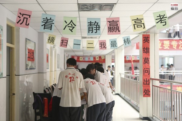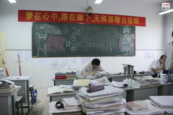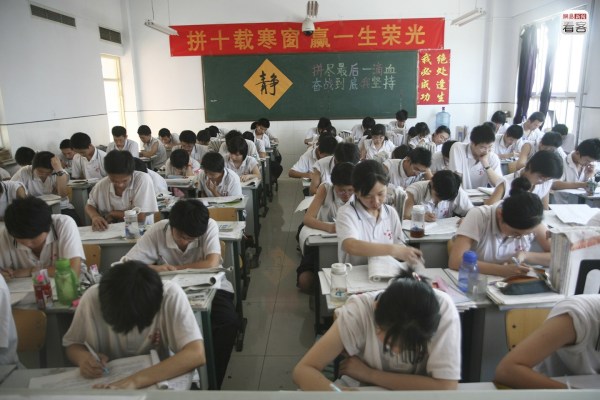 很難說在這種狂熱的氣氛下,學生們是不是真的能靜下心來。與狂熱氣氛相對的,是“冷”、“靜”這樣的詞匯的常見,不少教室也貼著“冷靜”的提示。圖為2012年6月2日,學生們準備高考。
