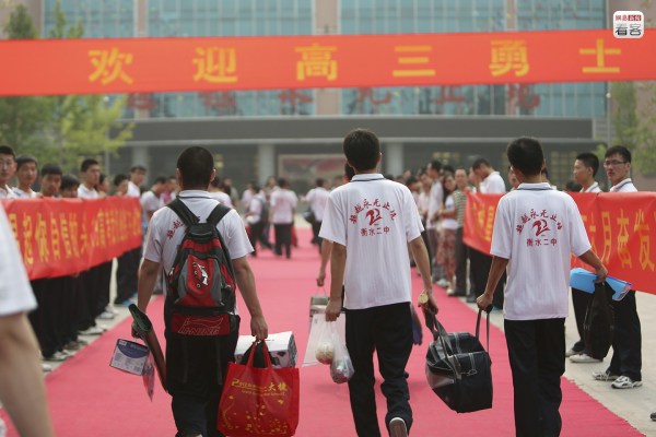 圖為2013年5月24日,衡水二中高三學生經(jīng)過短暫的休息返校,這次返校后他們下一次休息將是高考結(jié)束。歸校時,他們被譽為“勇士”,所有高三班主任則站在門口兩側(cè)迎接學生歸來。