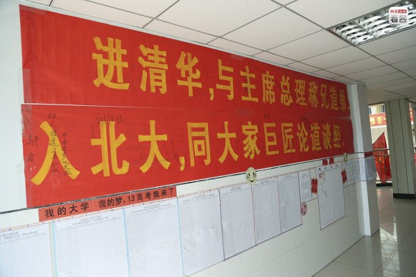 每當空閑的時候,她便望向路對面校門口的展板上那張考上清華、北大學生與校長的大合影。她希望明年在這里也能看到女兒的身影。