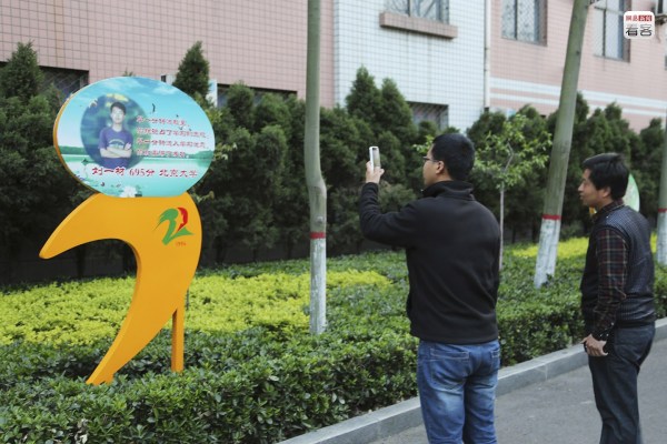 圖為2013年5月1日,行人在學校里拍照。草叢里樹立的牌子上是學校往屆考上北大學生的簡歷。
