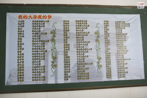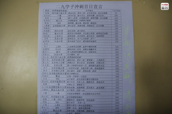 圖為2009年6月1日,墻上貼著學生們在沖刺百日時寫下的誓言,每個人的目標不同,但都會盡量具體到一個學校甚至增加多少分數(shù),也都會留下一個“宣言”激勵自己。
