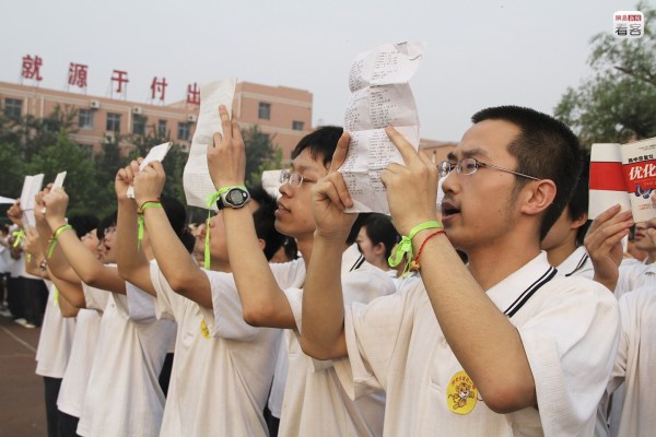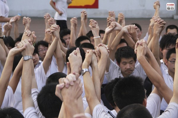 高考進行前,學校還會帶領學生進行最后一輪鼓勁,老師們穿著紅色T恤,背后寫著“和你在一起”,學生們則集體穿著白色T恤,在老師的帶領下喊口號。圖為2011年6月8日,學生們即將參加高考。