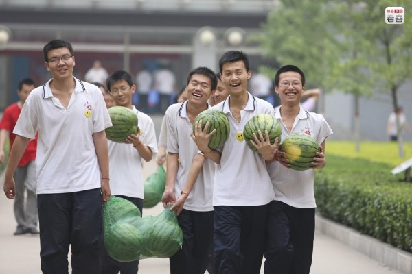 圖為2012年6月6日,學生們抱著學校發(fā)的西瓜,臨近高考,這種免費福利不少。而高考前一天晚上的晚自習,老師則會帶著學生們舉行一場“西瓜宴”