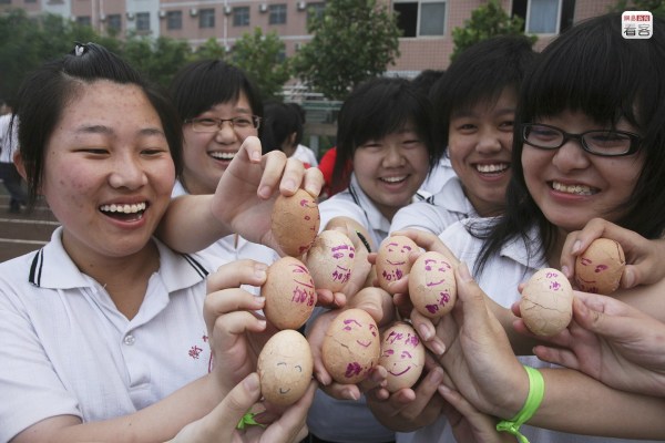 吃“幸運蛋”、過“成功門”也是學校每到高考前夕都會準備的活動。圖為2009年6月7日,學生們拿著畫著笑臉的雞蛋。