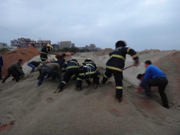 12月27日傍晚5點(diǎn)20分左右,悲劇發(fā)生在翔安馬巷鎮(zhèn)亭洋村亭洋公寓后面工地。圖為消防官兵和附近居民幫忙挖沙救人。