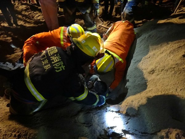 圖為消防官兵和附近居民幫忙挖沙救人。