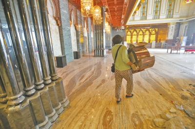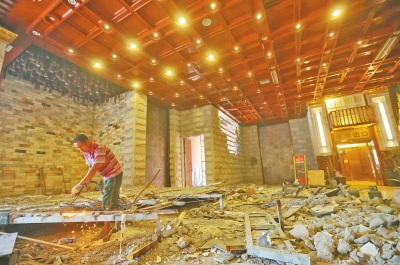 大廳內(nèi),金碧輝煌的樓頂和墻體以及各種燈飾等都還沒有拆除,大廳東側的一處1尺高的平臺正在拆除。在切割、拉扯、裝卸等雜音交響中,東北角一名工人拿著大錘對著室內(nèi)非承重墻猛砸,已砸出一個大窟窿。很顯然,這里正進行大規(guī)模拆除。