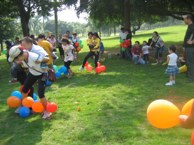 游戲規(guī)則:每個家庭由一名家長和一名孩子參加,由工作人員給參與的每個家庭發(fā)三個氣球和一根細繩,請家長將氣球吹大綁在自己的腳腕,身背孩子。聽到主持人的口令游戲開始,家長就背著寶寶踩其他家庭的氣球,在互相踩氣球的同時,首先要注意安全,其次要保護自己的氣球,還要將別的家庭的氣球踩破,氣球被踩爆即被淘汰,比一比誰是冠軍。