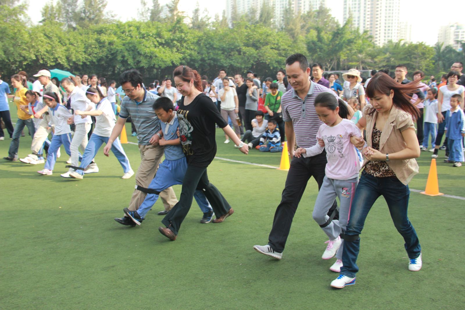 游戲規(guī)則:活動分組進行,每個家庭(兩大一小)為一組,家長在兩邊,孩子在中間,家長和孩子相鄰的兩條腿用10cm寬,60cm長的紅色布條綁住,聽到口令后,三人一齊向前跑,看誰先跑到終點為勝。(每組最多為5個家庭參與,活動分三組進行)