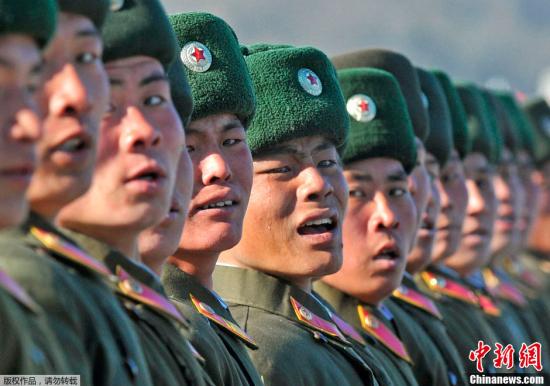 資料圖:2月16日,朝鮮人民軍陸海空三軍官兵展開盛大閱兵儀式。朝鮮人民軍陸??杖姽俦蚪鹑粘纱笤獛浐徒鹫沾笤獛洷硎境绺呔匆?,發(fā)誓無(wú)限忠于最高司令官金正恩。