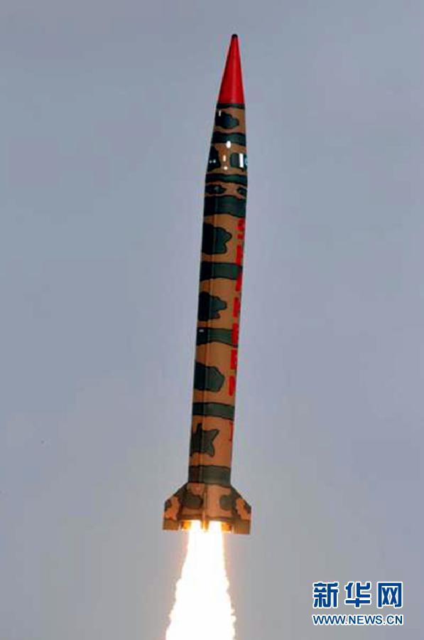 這張由巴基斯坦國際公共關系服務部門(ISPR)4月25日發(fā)布的照片顯示了成功發(fā)射的可攜帶核彈頭的中程彈道導彈。巴基斯坦軍方25日發(fā)表聲明稱,巴基斯坦當天成功發(fā)射了可攜帶核彈頭的中程彈道導彈,并成功擊中海上預定目標。