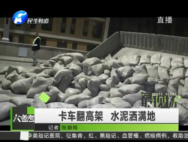 卡車偷上高架側(cè)翻 水泥撒一地