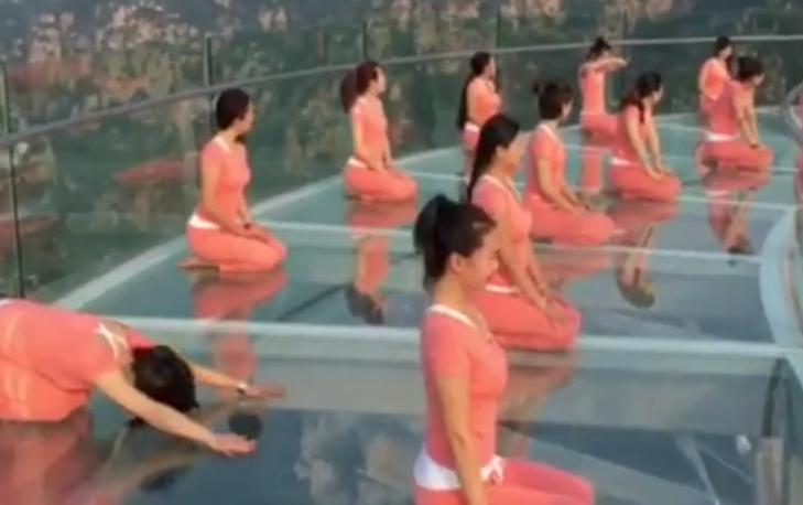 實拍百人懸空玻璃觀景臺上練瑜伽