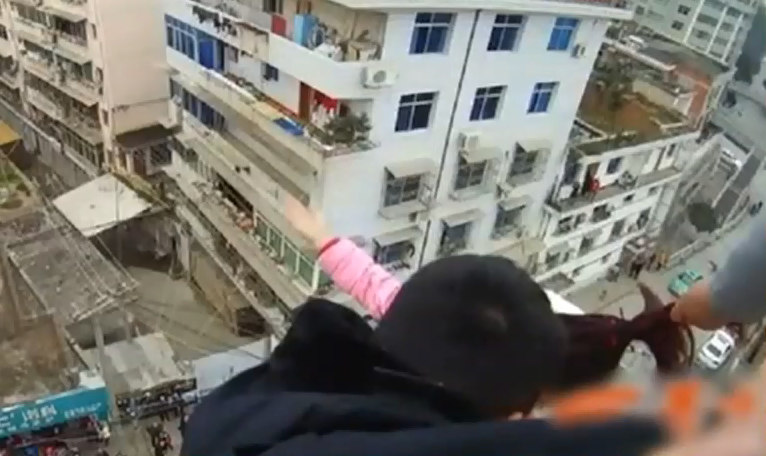 實(shí)拍:男子抓住跳樓妻子頭發(fā)