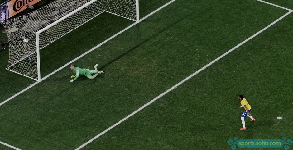 北京時間6月13日凌晨4時,2014年巴西世界杯揭幕戰(zhàn)在圣保羅競技場(科林蒂安競技場、伊塔蓋拉球場)展開,東道主巴西暫時2-1反超東歐勁旅克羅地亞。第69分鐘,奧斯卡右路低傳,弗雷德禁區(qū)內(nèi)得球,洛夫倫在身后有一個并不明顯的拉扯動作,巴西前鋒應(yīng)聲倒地,主裁判西村雄一順勢判罰點(diǎn)球,還向洛夫倫出示一張黃牌。克羅地亞球員不干了,立即圍住主裁判理論,但已經(jīng)無法改變結(jié)果。內(nèi)馬爾主罰的點(diǎn)球罰下球迷右側(cè),普萊蒂科薩撲到皮球但仍無法阻止皮球入網(wǎng),2-1,巴西逆轉(zhuǎn)比分,內(nèi)馬爾梅開二度。圖為破門瞬間