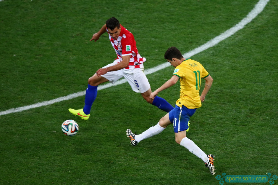 在巴西和克羅地亞的比賽最后時(shí)刻,拉米雷斯中場(chǎng)斷球,奧斯卡單騎闖關(guān),在禁區(qū)邊緣一記捅射再次洞穿普萊蒂科薩的十指關(guān),3-1,巴西鎖定勝局。最終,巴西隊(duì)?wèi){借內(nèi)馬爾的2個(gè)進(jìn)球,3-1逆轉(zhuǎn)克羅地亞贏得本屆世界杯的開(kāi)門(mén)紅。圖為奧斯卡捅射瞬間