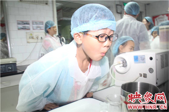 穿上白色的參觀服、戴上一次性帽子,受邀家庭進(jìn)入了檢測(cè)區(qū),參觀了質(zhì)量控制的檢測(cè)工作流程。正在工作的品控員,現(xiàn)場(chǎng)邀請(qǐng)了一名小朋友進(jìn)行了其中一項(xiàng)檢測(cè)--白利度檢測(cè)?!昂?jiǎn)單來(lái)講,就是利用密度儀,測(cè)試一瓶飲料的糖度和含氣量?jī)蓚€(gè)指標(biāo)?!逼房貑T張青介紹道。
