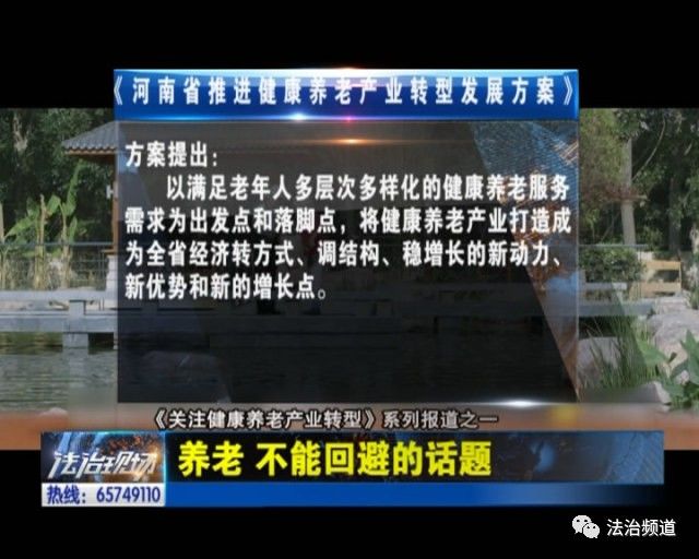生、老、病、死是自然規(guī)律。而養(yǎng)老,是每個(gè)家庭無法回避的話題。近日,我省出臺(tái)了關(guān)于養(yǎng)老產(chǎn)業(yè)發(fā)展的新政策。有業(yè)內(nèi)人士稱,這是惠及老年人以及養(yǎng)老產(chǎn)業(yè)發(fā)展的重大利好消息。那么,這些新政策有什么內(nèi)容,會(huì)帶來哪些福利?河南省發(fā)展改革委、河南廣播電視臺(tái)法治頻道,聯(lián)合推出了六集系列報(bào)道《關(guān)注健康養(yǎng)老產(chǎn)業(yè)轉(zhuǎn)型》,從今天開始,我們將為您逐一介紹。