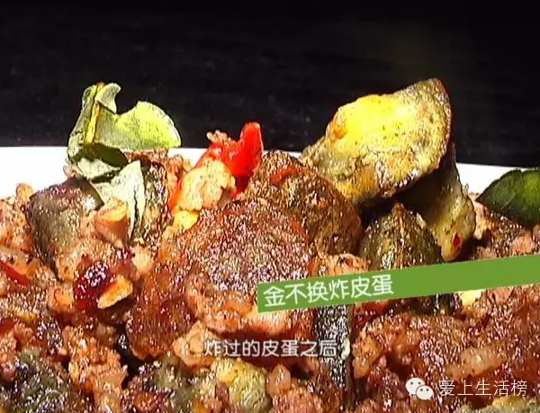 經(jīng)過(guò)炸制的皮蛋外酥里嫩,肉末讓這道菜更加扎實(shí),但最特別的還是這獨(dú)特的配料檸檬葉。