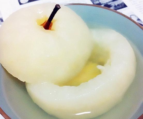 1.雪梨去皮從大頭挖個洞把果核挖出小心不要把梨子挖穿;