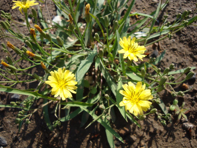原生形態(tài):抱莖苦荬菜多年生草本,高可達1米許。根粗壯而垂直。莖直立。根生葉排成蓮座狀,葉片長圓狀倒披針形,倒向羽裂狀或羽狀缺刻,先端短尖或鈍圓,基部慚狹成柄,花期通常不萎落;莖生葉基部抱莖。頭狀花序排成傘房狀;總苞圓摘狀,外層苞片極短小,內層苞片線狀披針形;花黃色,全部為舌狀花,先端5齒裂;花柱細長,柱頭2裂,冠毛白色,一層。瘦果紡錘形,稍扁,果喙長約為瘦果的1/4,通常與瘦果不同色?;ㄆ诖杭?。生于山腳、路邊、疏林內、河邊。