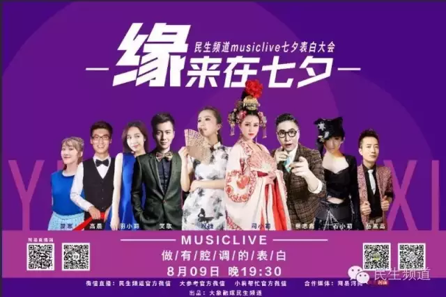 關(guān)注民生頻道微信公眾號(hào),2016年8月9日晚19:30,民生頻道 MUSIC LIVE緣來(lái)在七夕表白大會(huì)現(xiàn)場(chǎng)直播……