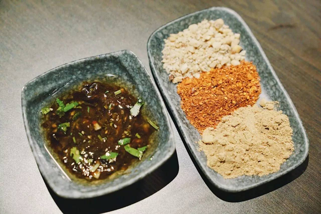 蘸料分為干碟和油碟(別找了,沒(méi)有芝麻醬),干碟里是花生碎、辣椒碎、豆粉;油碟里是香油、蠔油、蒜末,配上蔥花和香菜。蠔油可謂油碟的靈魂,是店家調(diào)制好的,可以根據(jù)自己喜好增減。